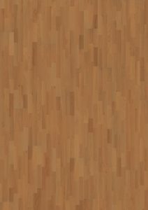 3-strip floor with a satin lacquer finish. It is a reddish floor with strips selected to provide a subdued, harmonious impression. 15mm Pre-Finished 3 Strip engineered flooring.